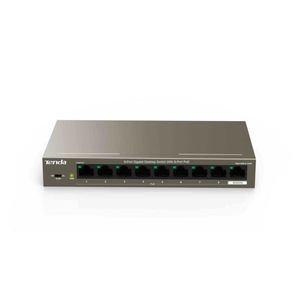 TEG1109P-8-102W, Tenda'nın Gigabit WLAN ve HD kamera monitör ağıoluşturma gereksinimi için özel olarak geliştirilen gigabityönetilmeyen yıldırımdan korunma özelliğine sahip switch cihazıdır.Yüksek performanslı erişimi ile 9-10/100/1000M Base-T Ethernet RJ45bağlantı noktaları; all port için 6KV yıldırım koruması; her bağlantınoktasısı için MDI / MDIX ve kablolu hızı desteği sağlar.