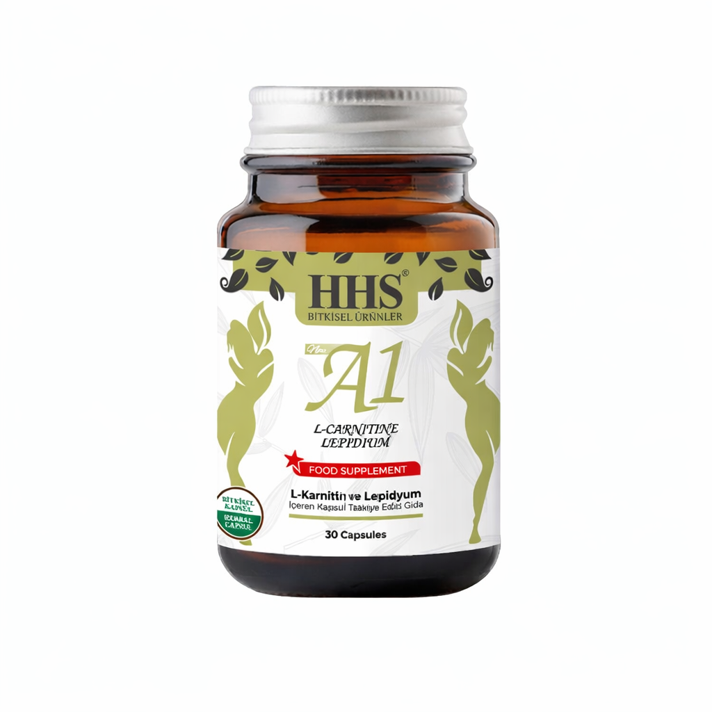 HHS New A1 L-Carnitine Lepidium 30 Kapsül. Kilo kontrolü ve formda kalma süreçlerini desteklemek için özel olarak formüle edilmiş; yağ yakımına yardımcı L-Karnitin ve diyet sürecinde enerji veren Lepidium içeren, cam şişede sunulan bitkisel takviye edici gıda.