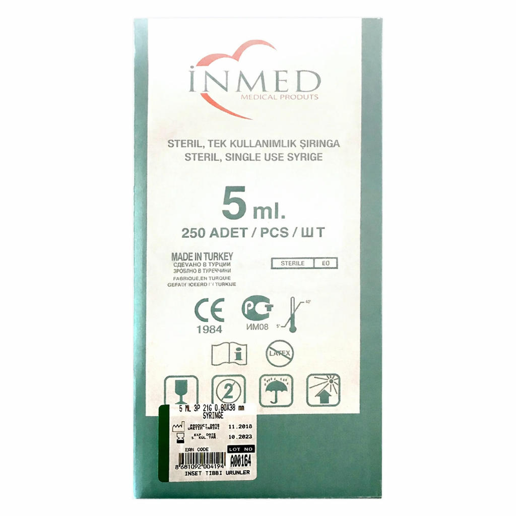 Inmed Enjektör 5 cc 3 Parça Yeşil - 250'li Kutu. Hastaneler ve özel klinikler için hazırlanmış 250'li avantajlı koli; kas içi enjeksiyonlar ve medikal sıvı çekimi için ideal 5 cc kapasite, 21G (yeşil) iğne ucu ve sızdırmaz kauçuk contasıyla pürüzsüz ilaç transferi sağlayan, steril, tek kullanımlık profesyonel medikal sarf malzemesi.