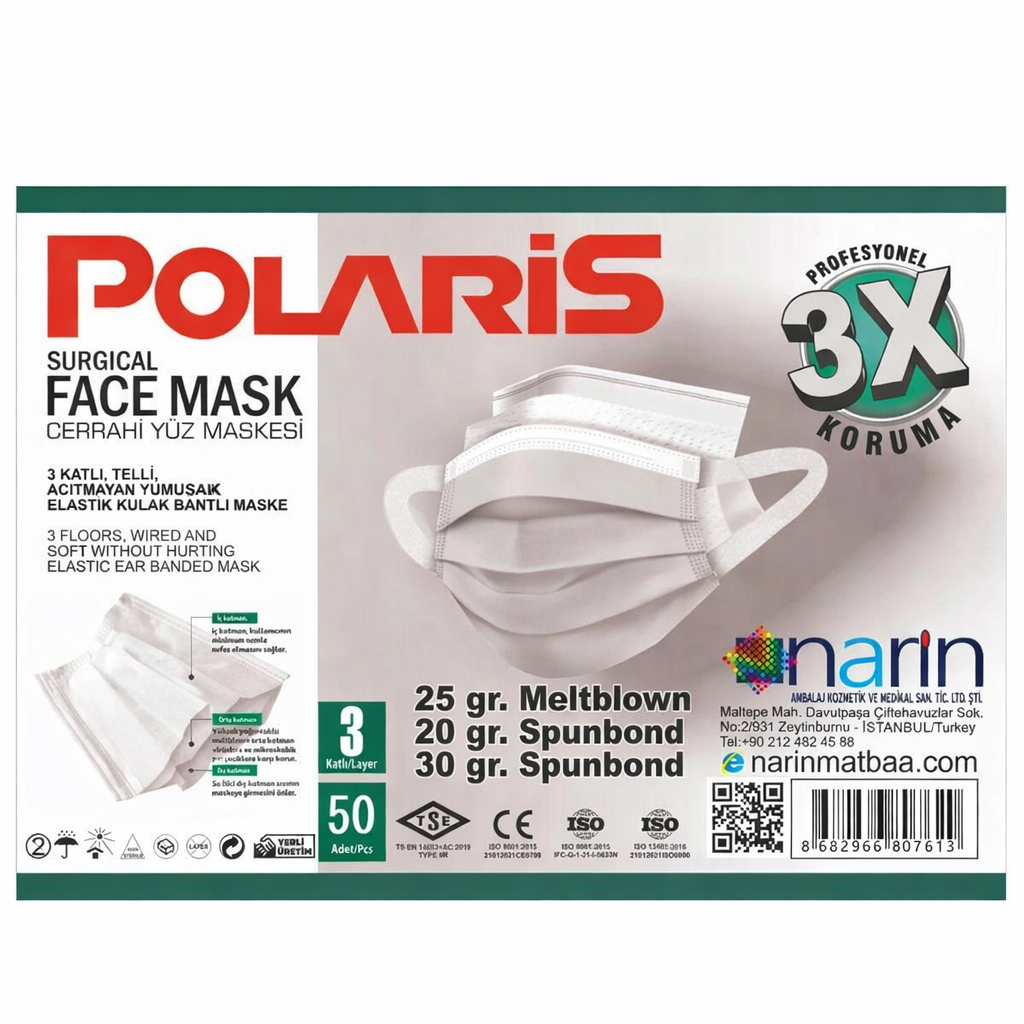 Polaris 3 Katlı Meltblown Cerrahi Maske. Yüksek filtrasyon kapasitesine sahip Meltblown orta katmanı ile tam koruma sağlayan beyaz cerrahi maske; yumuşak dokusu, kulakları acıtmayan rahat lastikleri ve yüze tam oturan burun teliyle günlük kullanımda hijyen ve konforu bir arada sunan 50'li ekonomik paket.