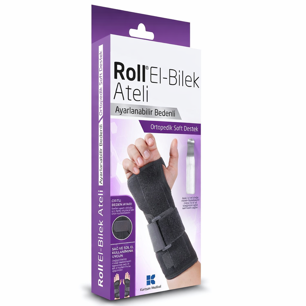 Roll El Bilek Ateli. Bilek eklemini sabit tutarak ağrıların azalmasına ve iyileşme sürecine yardımcı olan profesyonel ortopedik destek; başparmak hareketini kısıtlamayan ergonomik yapısı, her bilek ölçüsüne uyum sağlayan esnek tasarımı ve günlük kullanıma uygun konforlu dokusuyla bilek sağlığında güvenilir çözüm.