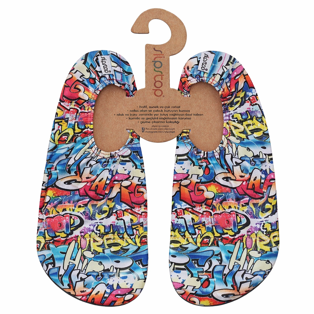 Slip Stop Hiphop Junior Deniz Ayakkabısı Medium (27-29). Çocuklar için özel olarak tasarlanmış; kaymaz tabanıyla ıslak ve kuru tüm zeminlerde güvenli tutuş sağlayan, nefes alan ve hızlı kuruyan kumaşıyla kumun sıcaklığından koruyan, enerjik hiphop desenli konforlu deniz ayakkabısı.
