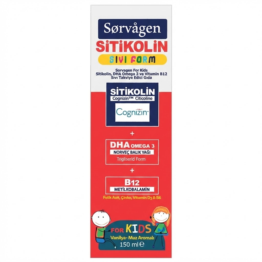 Sorvagen Kids Sıvı Form (150 ml). Norveç menşeli yüksek saflıkta Omega 3 (DHA), patentli Cognizin® Sitikolin ve B12 vitamini içeren; çocukların zihinsel gelişimini, odaklanma süreçlerini ve sinir sistemini desteklemek için geliştirilmiş lezzetli sıvı takviye.