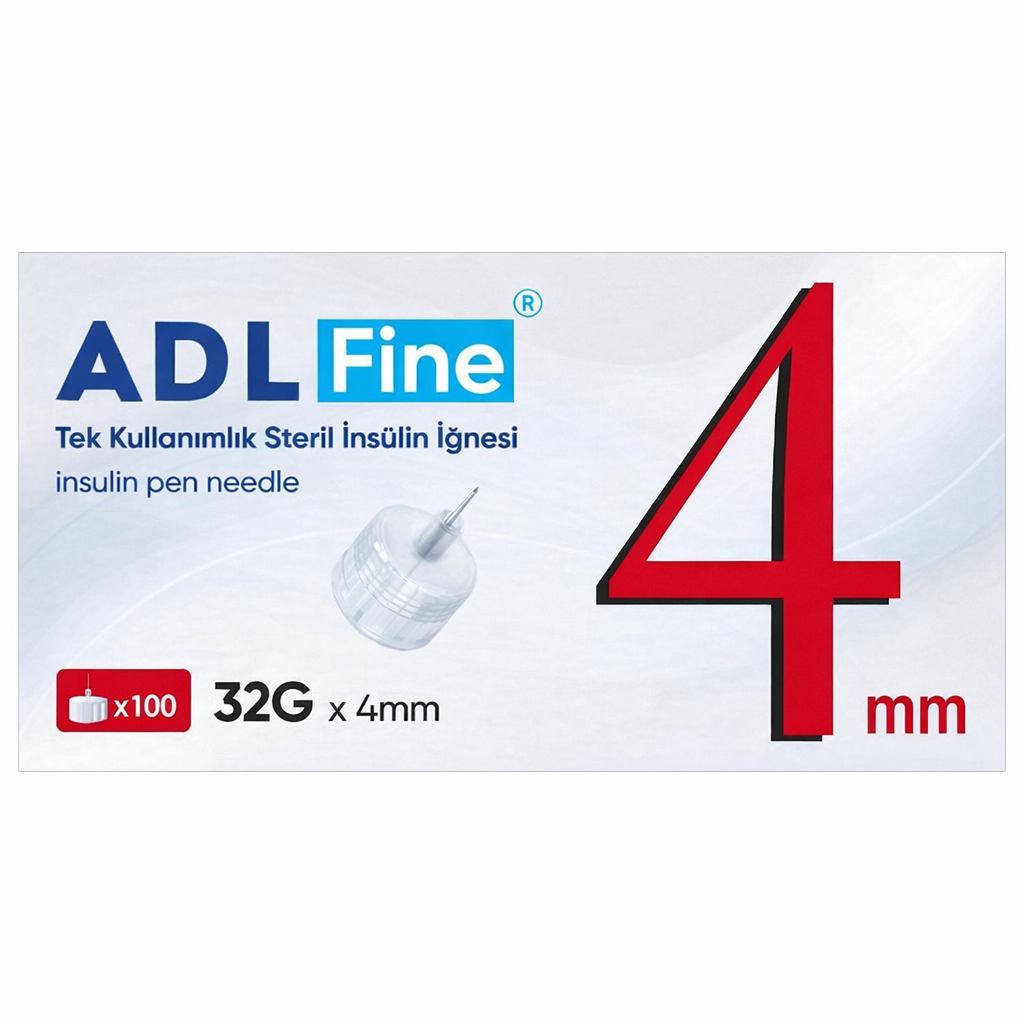 Adl Fine İnsülin Kalem İğnesi 4 mm 32G. İnsülin kalemi kullanıcıları için tasarlanmış ekstra hassas mikro uç; acıyı tamamen minimize eden 32G ultra ince yapı ve kas enjeksiyonu riskini önleyen 4 mm güvenli derinliğiyle her türlü insülin kalemiyle sızdırmaz uyum sağlayan steril, tek kullanımlık profesyonel kalem iğnesi.