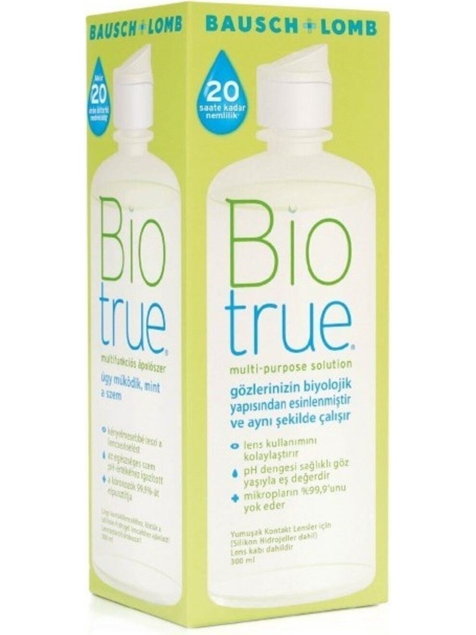 Biotrue Çok Amaçlı Lens Solüsyonu 300 ml. Sağlıklı gözyaşı ile birebir aynı pH seviyesine sahip olan ve gözün doğal nemlendiricisi Hyaluronan içeren; lensleri zararlı proteinlerden arındırıp dezenfekte ederken 20 saate kadar nemli ve konforlu kalmasını sağlayan, biyolojiden ilham alan yenilikçi bakım solüsyonu.